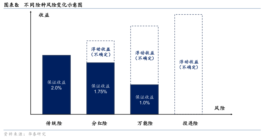 从客户视角看,传统险是“固收”产品,收益相对固定、不受投资波动的影响;投连险是“权益产品”,投资的风险由客户承担,回报的波动性较大;分红险是“固收”到“权益”过程中的中间状态,具有一定的保底收益,同时根据投资收益的变化,回报具备一定弹性,可以被视为“固收+”产品。