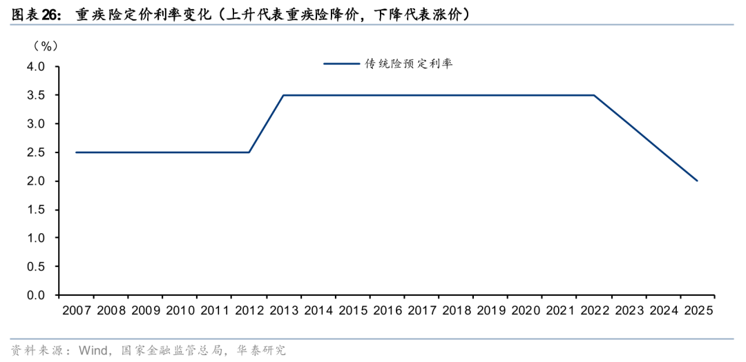 潜在客户逐渐累积。重疾险新单保费从2019年开始负增长,过去五六年的销售情况较为低迷。我们估计,2024年重疾险新单销售数量不足500万张,约为2018年峰值的九分之一。2014年至2020年期间,新单累计销售数量约为2.2亿张,而2021年至2024年估计新单数量为4000多万张。在此期间,不少处于适龄阶段、已经具备一定收入和消费能力的人群,因市场供给与销售环境的变化而推迟或暂缓了购买重疾险的决策。随着时间推移,这部分人群作为“潜在需求”沉淀下来。未被充分释放的保障需求在市场中积累,形成了可观的潜在客户储备。一旦行业环境改善、产品更贴合客户需要,或销售渠道重新激活,这部分潜在客户群体有望集中释放需求,从而推动重疾险市场的再度增长。