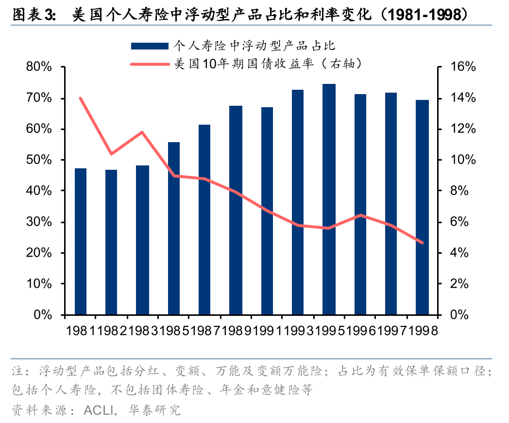 美国浮动型产品占比较高,并在20世纪八九十年代利率下行期快速提升。美国个人寿险(不含年金、健康险)中的浮动型产品包括分红、变额、万能及变额万能险,1980年左右占比在40%~50%的高位,二十世纪八九十年代利率快速下行期,浮动型产品占比呈现增加趋势,90年代末达到70%左右,不保证收益的产品成为主要类别。年金也类似,浮动型产品(变额年金)占比在上世纪九十年代快速攀升,由1990年的4%上升至1999年的51%,主要受利率下行至低位、股市繁荣发展以及政策等因素驱动。