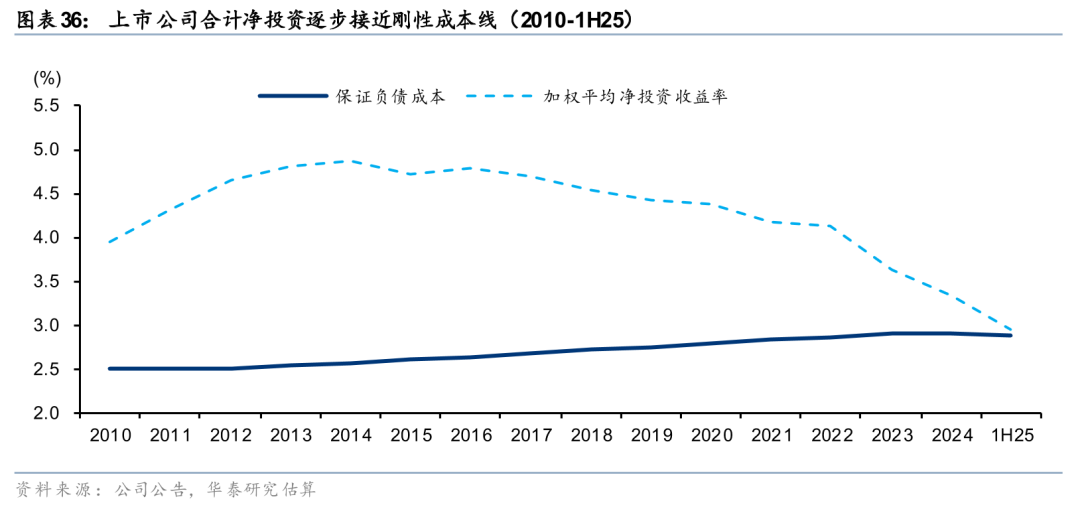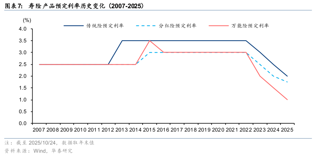 分红账户划分是分红险精细化经营的关键。由于客户会享有分红险的经营收益,所以划定经营收益的边界是准确和公平合理分红的前提。分红险应该有明确的底层资产划分,不同风险特征的分红险应该被划分成不同的账户进行管理。例如低保证和高保证的分红险就不应该进入同一个账户,客户的风险承受能力和收益预期不同,其资产端的风险属性也不应该一样。历史上2015年之前的分红险预定利率为2.5%。之后直到2023年预定利率为3.0,但实际经营中大部分产品仍然以2.5%定价。2023预定利率重新回到2.5%,2024年降到2.0%,2025年降至1.75%。我们估计目前保险公司负债端规模最大的分红险是以2.5%定价的,3.0%或2.0%定价的产品均较少,1.75%定价的产品目前规模极小,但未来有望成为主流。