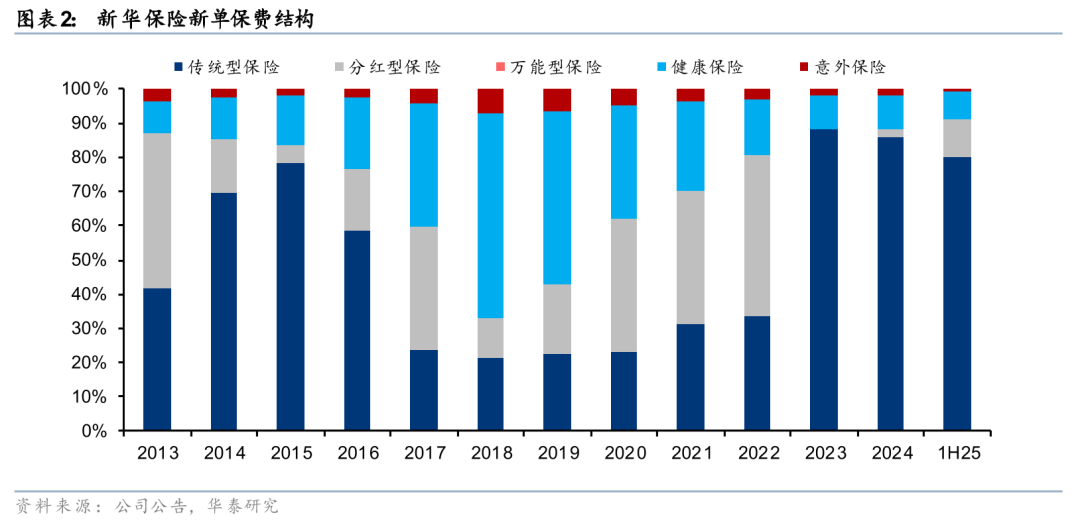 转变发生在2013年。考虑到当时市场利率处于高位,较低的预定利率导致保险产品缺乏竞争力,监管机构将传统险预定利率从2.5%提升到3.5%,与当时的市场利率差距大大缩小。对客户而言,保险产品即便设计成传统型,其隐含收益也变得足够有吸引力。传统险结构简单,保险代理人和客户都容易理解,因此传统险销量开始上升。在此后的十多年中,市场利率趋势向下,3.5%的预定利率愈发显得有吸引力,传统型人身险在保费中的占比节节升高。我们估计,在过去的几年中,传统险占据了行业新单保费的绝大部分,有其以传统型增额终身寿为代表。以新华保险为例,2023年以来,新单保费中传统险占比超过八成。