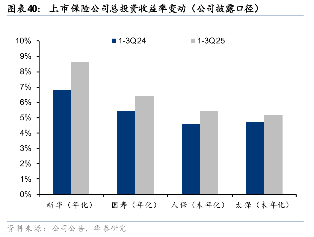 2025年三季度股市表现强劲,科技等成长股涨幅较大,从大盘表现看,第三季度沪深300涨幅达17.9%,在2024年高基数的情况下(3Q24涨幅16.1%),涨幅同比有所提升。在权益投资表现强劲的带动下,上市保险公司前三季度总投资收益均实现较大幅度增长,带动总投资收益率同比有所提升。在总投资收益率的支撑下,综合投资收益率同比也实现了不同程度的提升。由于上市保险公司多数未披露综合投资收益率,我们按照华泰口径计算了各公司的综合投资收益率(综合投资收益=总投资收益+FVOCI权益的公允价值变动,不包含FVOCI债权投资公允价值变动),口径可能与公司的计算方法不完全一致。根据我们的计算结果,上市公司前三季度综合投资收益率均有不同程度提升。