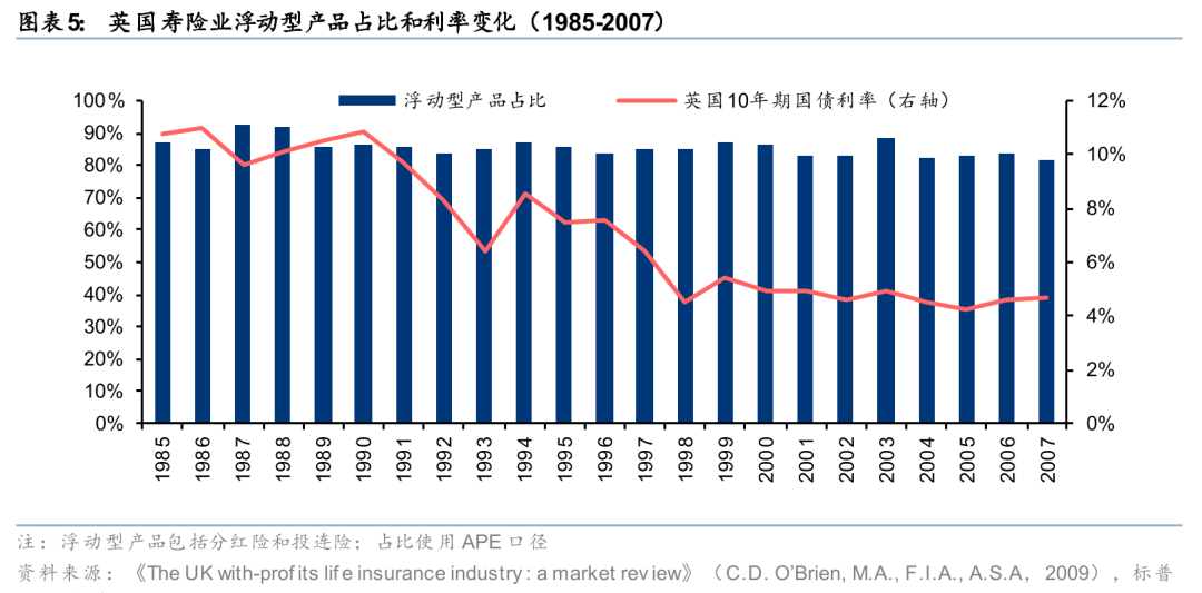 英国浮动产品占比维持80%~90%高位。英国寿险业浮动型产品包括分红险和投连险,其APE合计占比在1985-2007年保持较高位置(超80%),表明在英国这个成熟寿险市场中,利率下行期以浮动型产品为主。具体来看,1985-2000年,分红险占比基本维持在30%~40%左右,投连险占比略高(40%~50%)。而后2000-2007年股市大幅上涨,带动投连险占比提升,压缩分红险份额,但总体来看,浮动型产品占比维持在80%~90%的较高水平。