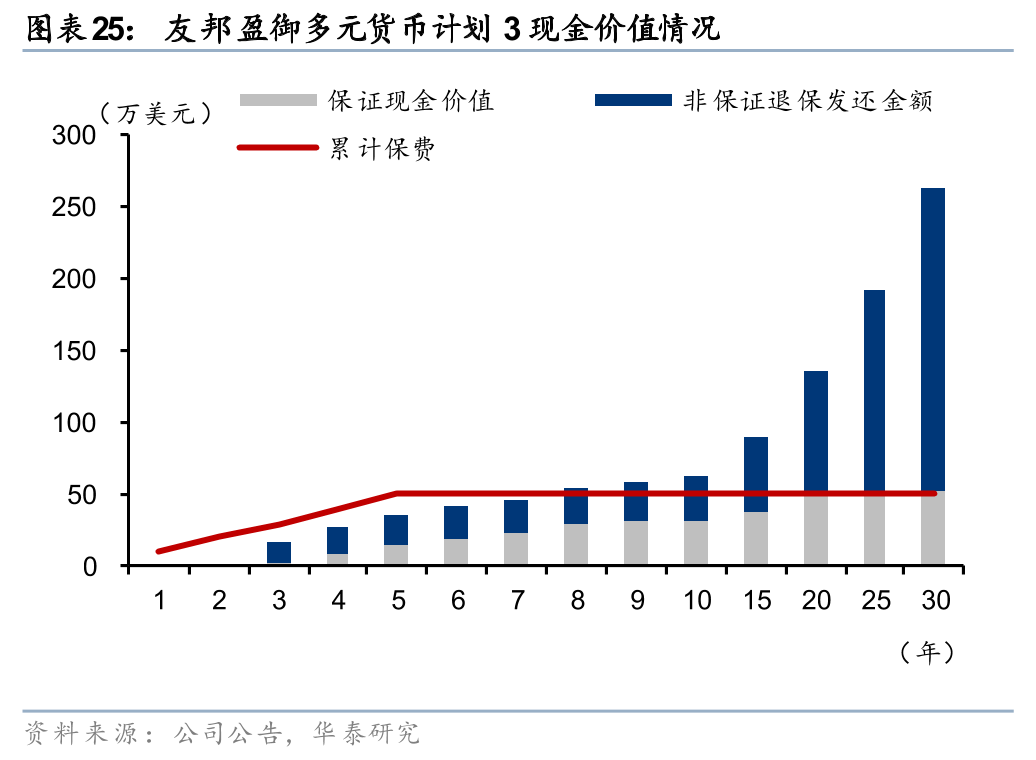 对于“低保证、高分红”产品,以友邦在香港地区销售的“盈御多元货币计划3”为例,该产品保证内部回报率0.31%,估计预定利率在0.5%左右,远低于大陆分红险1.75%的预定利率水平。产品收益主要依赖于分红(非保证收益)。例如,假设投保人交费期限为5年,每年保费10万美金,那么30年后含分红的预期收益达26万美元,其中非保证收益高达20.9万美元。