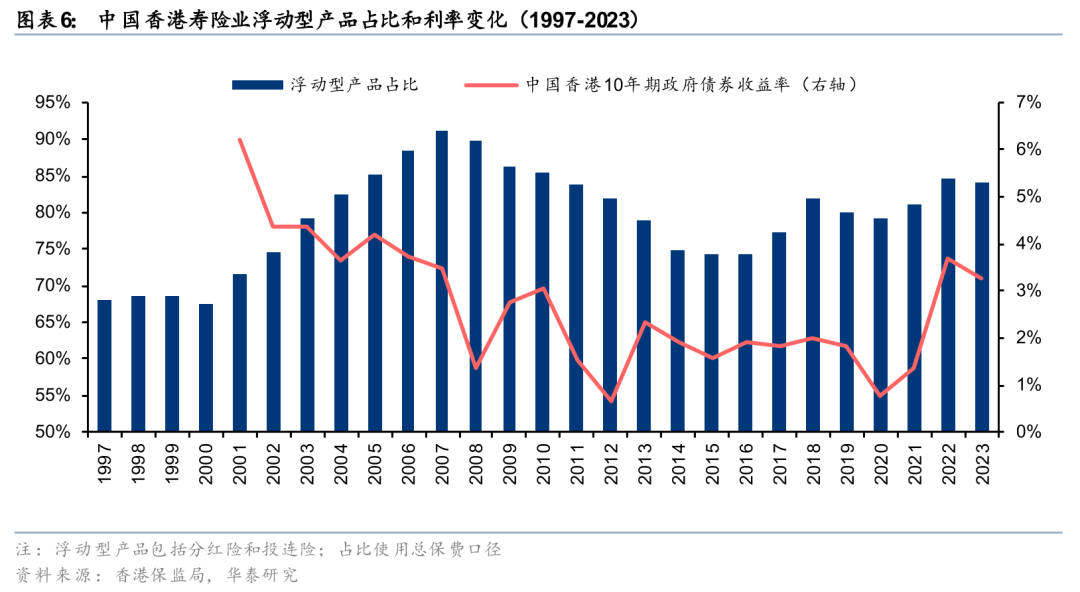 2000年以来中国香港浮动型产品占比维持在65%以上。中国香港浮动型产品包括分红险和投连险。在利率快速下行期(2000-2007年),中国香港寿险业浮动型产品占比快速上升,主要原因为投连险快速增长。中国香港股市在此期间高速发展,带动投资型保险热销,2007年时投连险保费占比达到51%。在2008年金融危机后,投连险占比快速萎缩,2023年时仅有8%,带动浮动型产品占比在2007-2015年有所下降。与此同时,分红险却实现了长期发展,随着利率下行,分红险保费占比在2020年时上升至71%。总的来看,2000年以来,中国香港寿险业浮动型产品占比维持在65%以上,最高曾达到90%以上的高位。