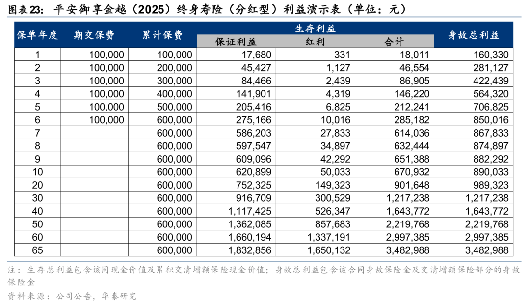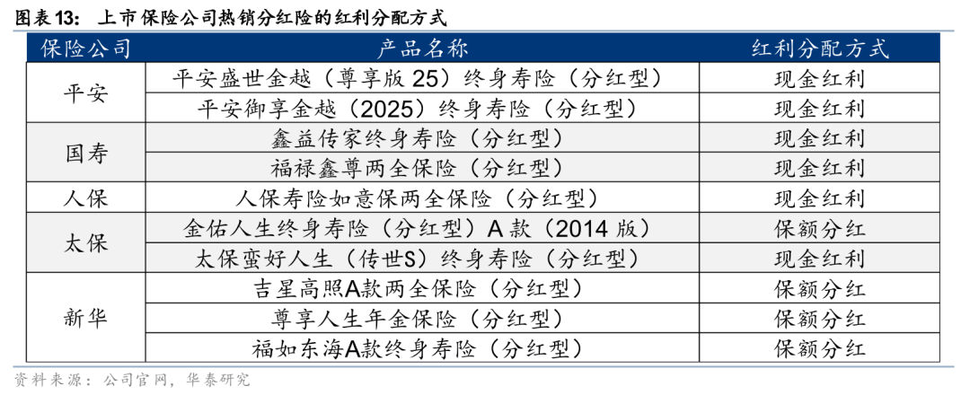 从五家A股上市保险公司的产品看,红利分配方式既有现金分红、也有保额分红。例如,平安在2024年报中重点提到的“金越尊享”、“御享金越”分红险为现金分红;新华保险曾经热销的吉星高照A款两全保险(分红型)、尊享人生年金保险(分红型)、福如东海A款终身寿险(分红型)等,为保额分红。