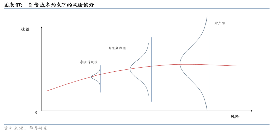 分红险负债采用浮动收费法(VFA)计量,在资产价值能够覆盖分红保证收益的前提下,资产和负债的变动一致,负债等于对应底层资产的公允价值。这样一来,资产负债同涨同跌,互为镜像,资产负债波动不一致的错配风险大幅降低,因此分红险可以投资更多的风险资产(如权益)。同时,分红险的刚性负债成本低于传统险,负债端的约束也相对较低,能支持投资端相对灵活。