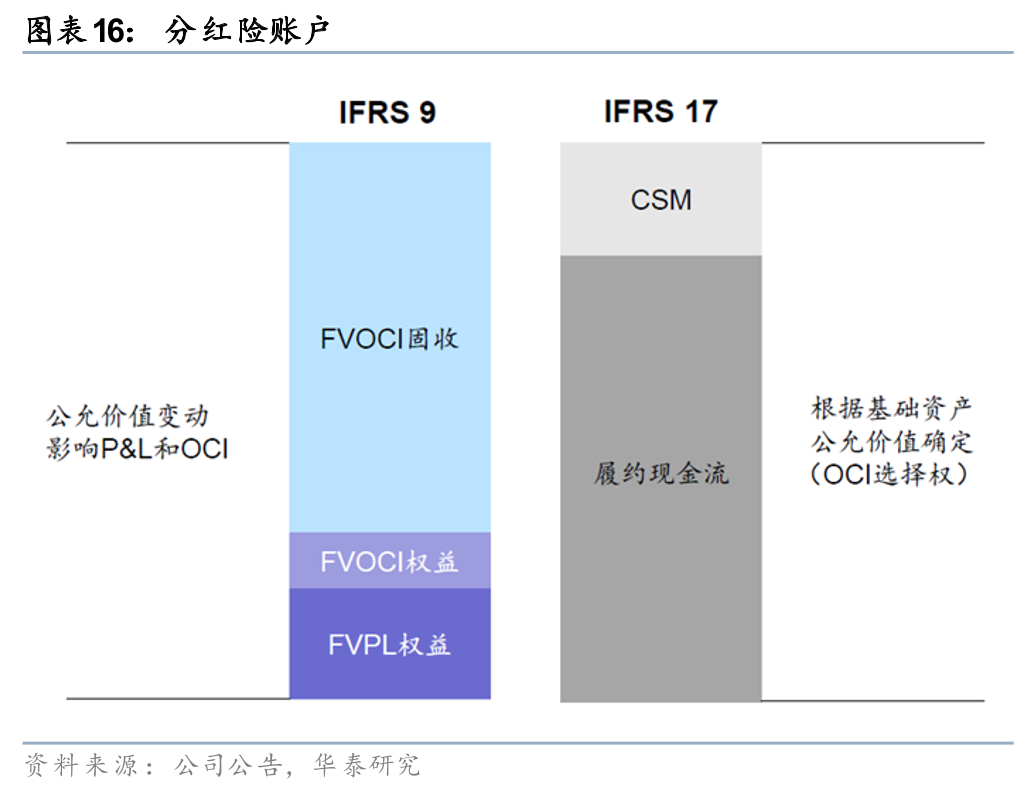 分红险的客户相较于传统险承担了更多的投资波动风险,因此保险公司分红保险账户的投资风险偏好相对会高一些。此外,分红险的分红水平是保险公司销售端的重要竞争点,保险公司也倾向于投资更多的风险资产来获取长期的超额收益。保险新会计准则(IFRS17)将分红险视作收取管理费的代客理财业务,分红险的负债计量适用浮动收费法(VFA),资产端的投资波动在一定程度上可以被负债吸收,不会影响会计利润,也减少了保险公司投资风险资产的“后顾之忧”。这些因素决定了分红险的资产负债匹配和传统险有较大不同,分红险资产配置更加灵活,风险资产比例更高。