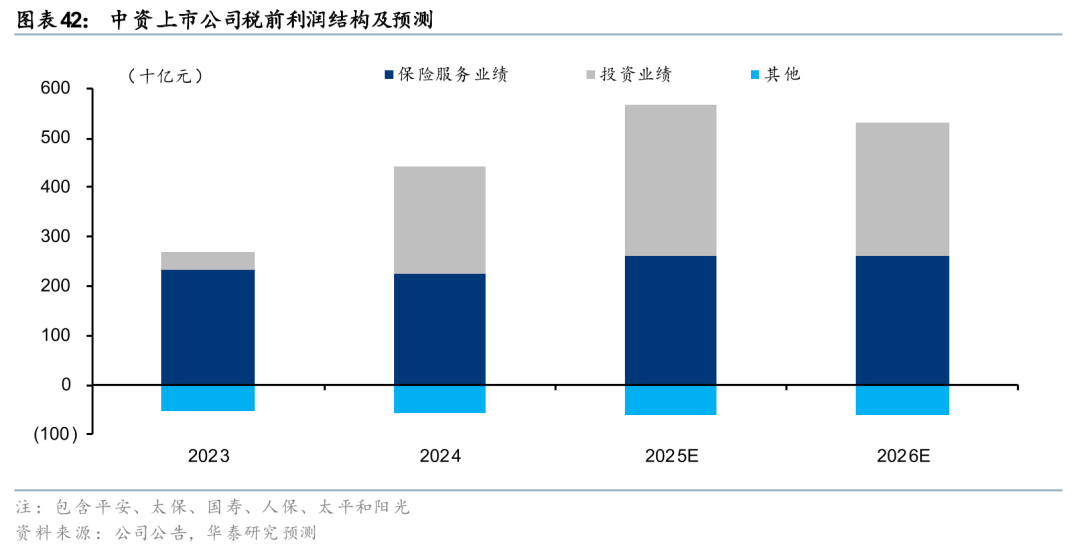 保险公司的利润可拆分为保险服务业绩、投资业绩和其他业绩三部分,三者之和等于税前利润,其中保险服务业绩相对稳定,投资业绩波动较大,其他业绩占比较低。2025年前三季度,除平安外的4家A股上市保险公司的合计投资业绩同比大幅提升59%,处于较高水平。从利润结构看,前三季度投资业绩占税前利润的比例高达69%,投资对利润形成较强支撑,也给2026年带来高基数压力。我们预计2026年投资收益仍对利润有较大正面贡献,但同比可能有所下滑,或导致利润负增长。