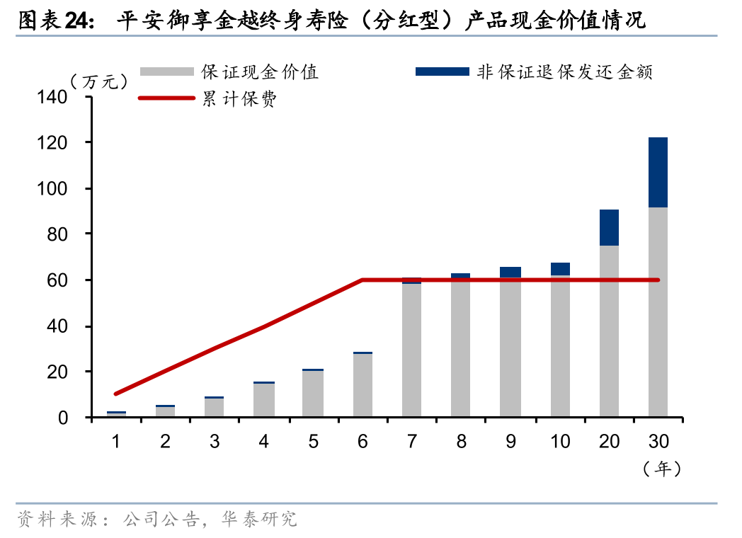 1) 内地以平安御享金越(2025)终身寿险(分红型)产品为例,假设投保人交费期间6年,年交保险费 10万元,红利领取方式为购买交清增额保险,那么保证回本期限为9年,含红利回本期限为7年,客户没有牺牲太多流动性。