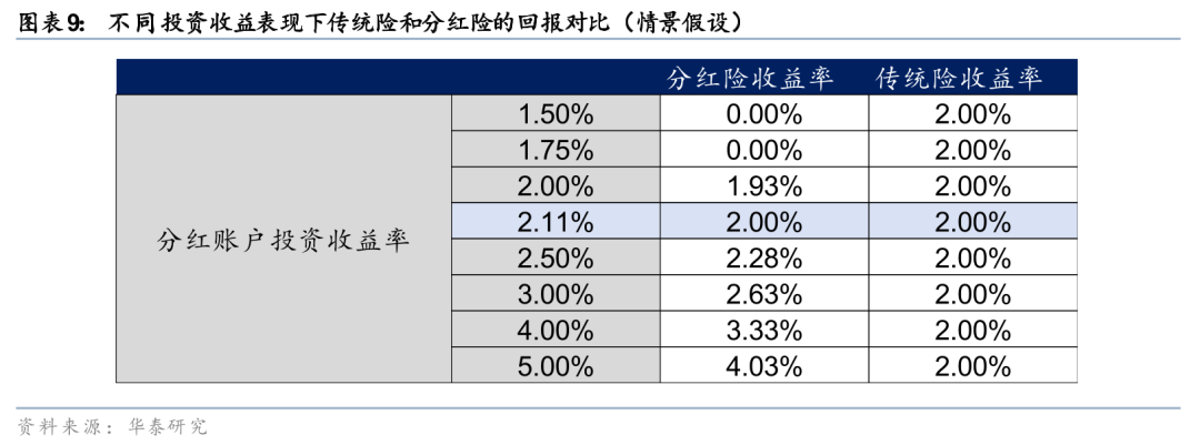 在当前的市场环境下,分红保险的整体回报要好于传统险。当前传统险的预定利率为2.0%,分红险的预定利率为1.75%。如果分红险账户的投资收益率达到2.11%,那么保底+浮动总收益水平为1.75%+(2.11%-1.75%)×70%=2.0%,就能与传统险的回报相当。从长期看,如果保险行业能维持3-4%的长期投资回报,换算成分红险的收益,有望达到2.6-3.3%。