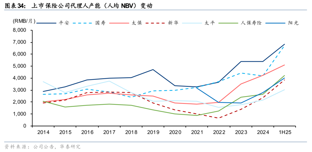 上市保险公司代理人产能存在较大差异,横向对比看,平安、国寿和太保的人均NBV相对较高,其余四家公司相对较低。纵向看,从2022年左右,随着行业需求修复、代理人改革成效显现,上市保险公司代理人产能开始反弹,1H25达到新的历史高位。