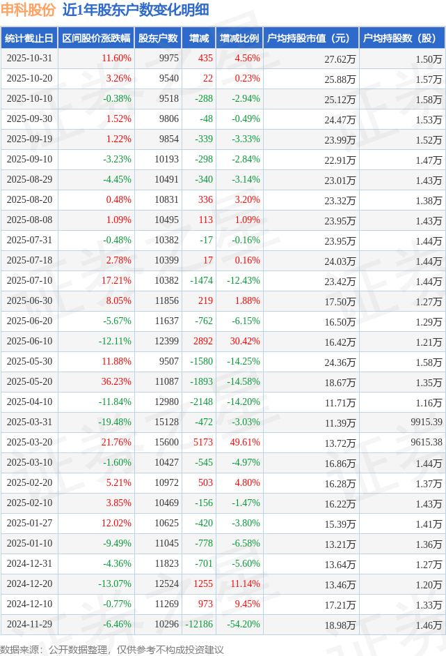 从股价来看,2025年10月20日至2025年10月31日,申科股份区间涨幅为11.6%,在此期间股东户数增加435.0户,增幅为4.56%。