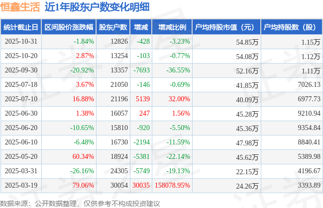 从股价来看,2025年10月20日至2025年10月31日,恒鑫生活区间跌幅为1.84%,在此期间股东户数减少428.0户,减幅为3.23%。