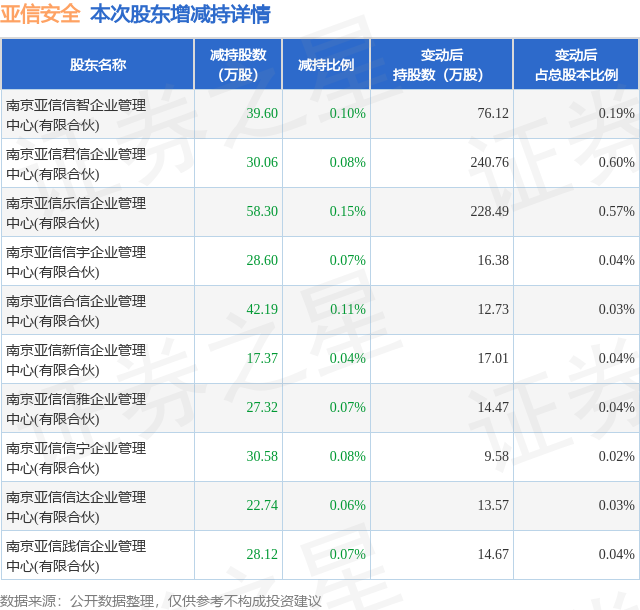 证券之星消息,11月3日亚信安全发布公告《亚信安全:股东减持股份结果公告》,其股东南京亚信信智企业管理中心(有限合伙)、南京亚信君信企业管理中心(有限合伙)、南京亚信乐信企业管理中心(有限合伙)、南京亚信信宇企业管理中心(有限合伙)、南京亚信合信企业管理中心(有限合伙)、南京亚信新信企业管理中心(有限合伙)、南京亚信信雅企业管理中心(有限合伙)、南京亚信信宁企业管理中心(有限合伙)、南京亚信信达企业管理中心(有限合伙)、南京亚信践信企业管理中心(有限合伙)于2025年10月1日至2025年11月3日间合计减持324.88万股,占公司目前总股本的0.8122%,变动期间该股股价下跌6.89%,截止11月3日收盘报20.39元。