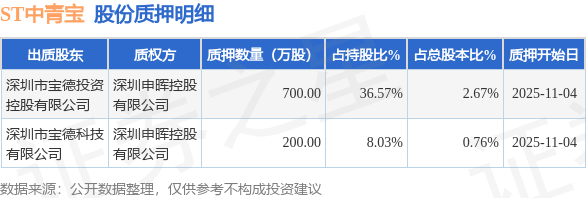 截止本公告日,股东深圳市宝德科技有限公司已累计质押股份2490.34万股,占其持股总数的100.0%,股东深圳市宝德投资控股有限公司已累计质押股份1900.0万股,占其持股总数的99.26%。本次质押后ST中青宝十大股东的累计质押股份占持股比例(占持股比例的计算以公司最新一期财务报表公布的十大股东的持股总数为基准)见下图: