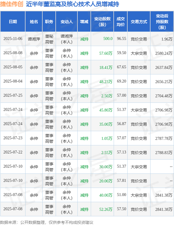 捷佳伟创近半年内的董监高及核心技术人员增减持详情如下: