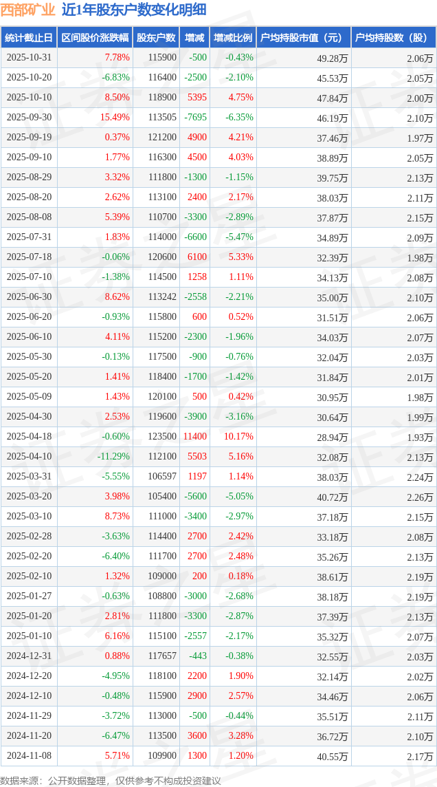 从股价来看,2025年10月20日至2025年10月31日,西部矿业区间涨幅为7.78%,在此期间股东户数减少500.0户,减幅为0.43%。