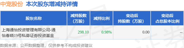 证券之星消息,11月7日中宠股份发布公告《中宠股份:关于控股股东之一致行动人减持计划实施完成的公告》,其股东上海通怡投资管理有限公司-通怡春晓19号私募证券投资基金于2025年9月17日至2025年11月6日间合计减持298.1万股,占公司目前总股本的0.9794%,变动期间该股股价上涨3.99%,截止11月6日收盘报57.8元。