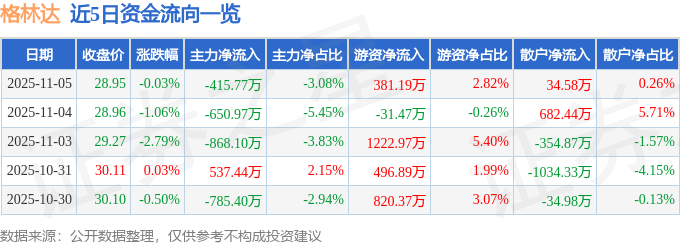 11月5日的资金流向数据方面,主力资金净流出415.77万元,占总成交额3.08%,游资资金净流入381.19万元,占总成交额2.82%,散户资金净流入34.58万元,占总成交额0.26%。