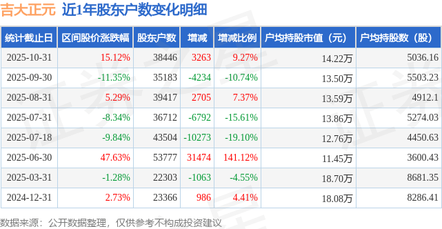从股价来看,2025年9月30日至2025年10月31日,吉大正元区间涨幅为15.12%,在此期间股东户数增加3263.0户,增幅为9.27%。