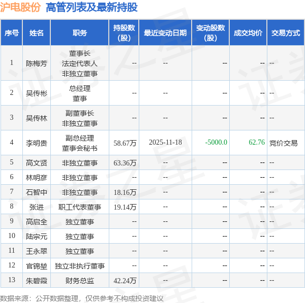 证券之星消息,根据11月7日市场公开信息、上市公司公告及交易所披露数据整理,沪电股份(002463)最新董监高及相关人员股份变动情况:2025年11月6日公司董秘,高管李明贵共减持公司股份5.0万股,占公司总股本为0.0026%。变动期间公司股价上涨3.01%,11月6日当日收盘报72.51元。