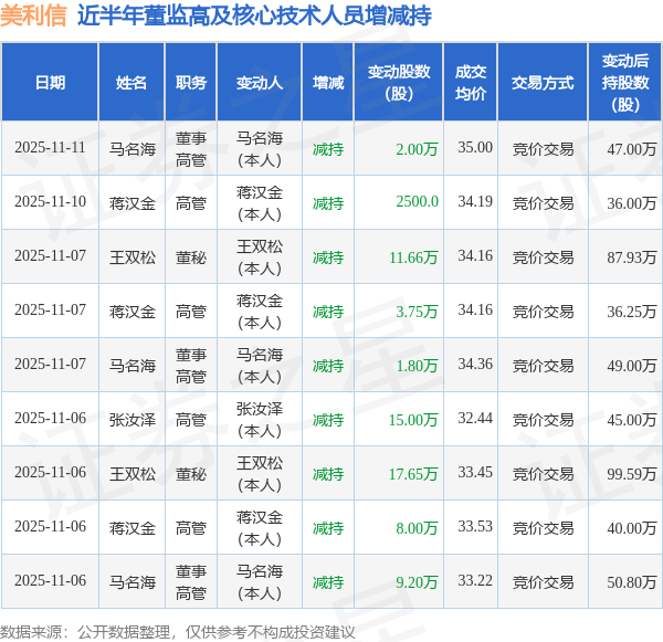 美利信近半年内的董监高及核心技术人员增减持详情如下: