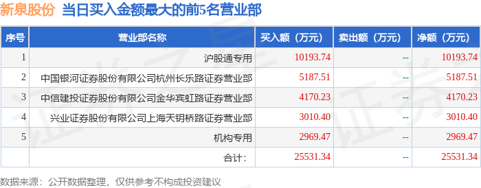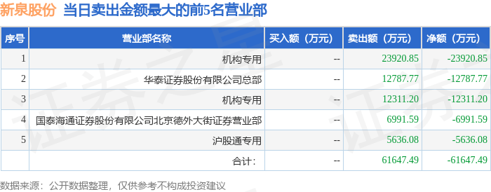 证券之星消息,沪深交易所2025年11月10日公布的交易公开信息显示,新泉股份(603179)因有价格涨跌幅限制的日收盘价格跌幅偏离值达到7%的前五只证券登上龙虎榜。此次是近5个交易日内第1次上榜。