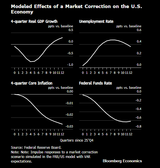 彭博经济研究使用美联储的FRB/US模型,模拟了股市和债市回调的宏观经济影响,该模拟与美联储工作人员为联邦公开市场委员会(FOMC)准备的假设类似。模拟结果显示,经济增长和就业可能出现明显放缓,但不会太严重——如果回调造成的损失对金融体系的运转构成重大扰动,下滑幅度也有可能会更大。