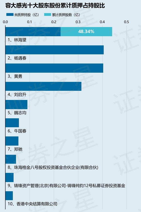 截止本公告日,股东林海望已累计质押股份2132.2万股,占其持股总数的48.34%。本次质押后容大感光十大股东的累计质押股份占持股比例(占持股比例的计算以公司最新一期财务报表公布的十大股东的持股总数为基准)见下图: