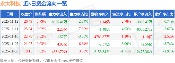 11月12日的资金流向数据方面,主力资金净流出8325.41万元,占总成交额2.04%,游资资金净流入1.14亿元,占总成交额2.78%,散户资金净流出3027.47万元,占总成交额0.74%。