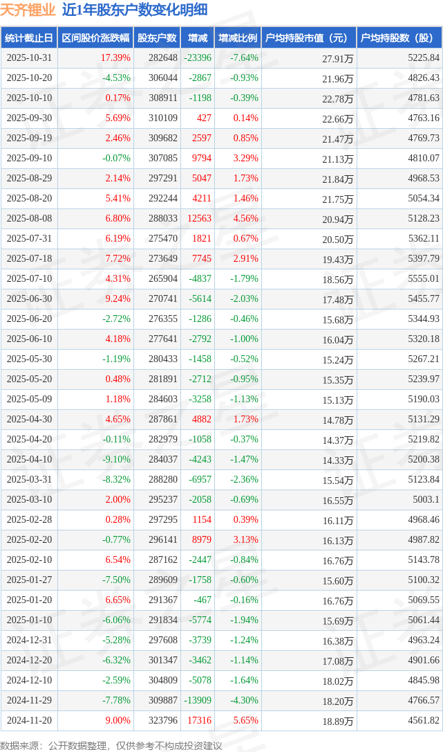 从股价来看,2025年10月20日至2025年10月31日,天齐锂业区间涨幅为17.39%,在此期间股东户数减少2.34万户,减幅为7.64%。