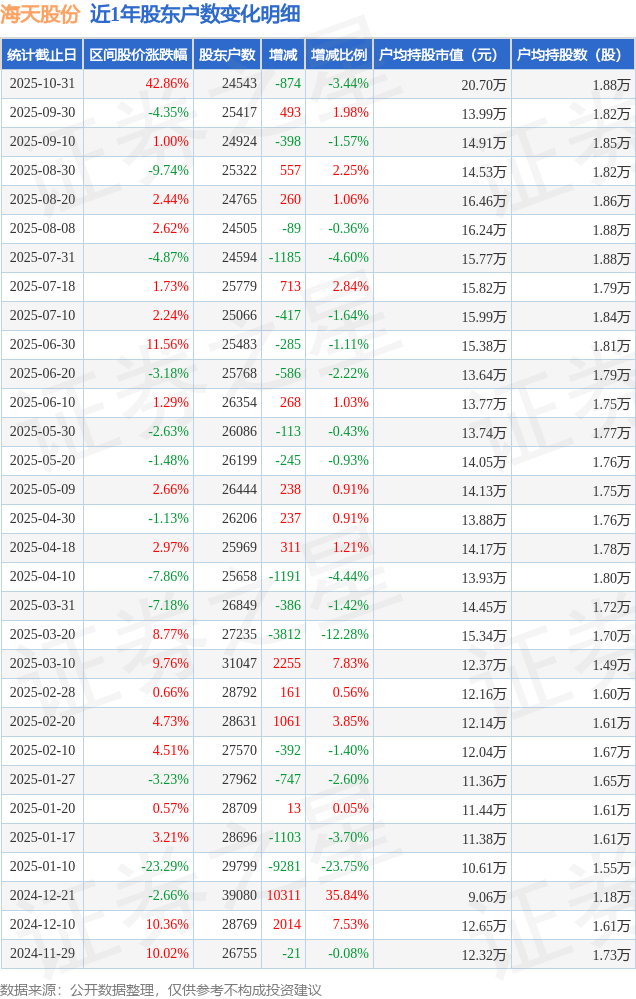 从股价来看,2025年9月30日至2025年10月31日,海天股份区间涨幅为42.86%,在此期间股东户数减少874.0户,减幅为3.44%。