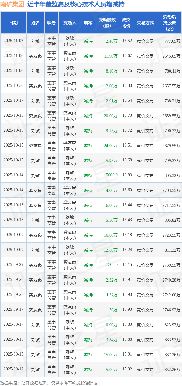 南矿集团近半年内的董监高及核心技术人员增减持详情如下:
