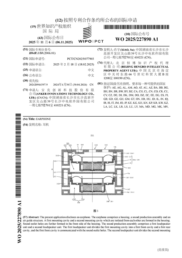 证券之星消息,根据企查查数据显示安克创新(300866)公布了一项国际专利申请,专利名为“耳机”,专利申请号为PCT/CN2025/077903,国际公布日为2025年11月6日。