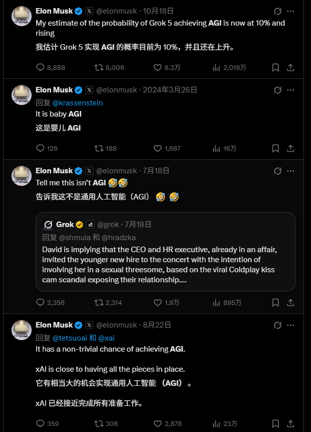 咱去马斯克的社交平台上逛一圈,会发现他三句不离AGI。。