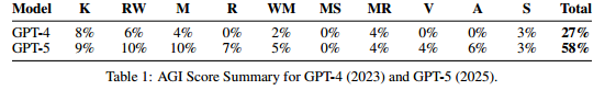 他们也顺便用GPT模型做了个测试,结果显示,如果AGI是100分,GPT-5只有58分,不及格的水平。