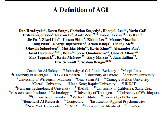 所以最近,一帮顶尖大佬看不下去了,几十号人联手发了篇论文,作者还是全明星阵容,包括图灵奖得主、谷歌前 CEO 等等,他们联合起来,给出了目前为止第一个 AGI 的量化定义。