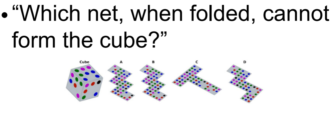 “下面这 4 个 2D 展开图里,哪一个不能折成左边那个立方体?”