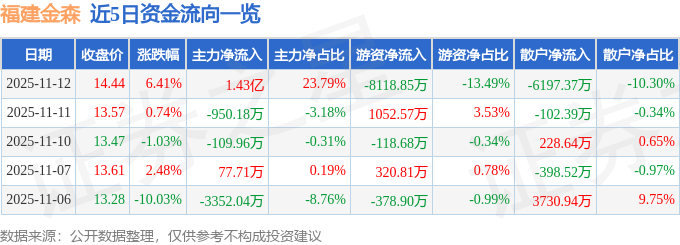 11月12日的资金流向数据方面,主力资金净流入1.43亿元,占总成交额23.79%,游资资金净流出8118.85万元,占总成交额13.49%,散户资金净流出6197.37万元,占总成交额10.3%。