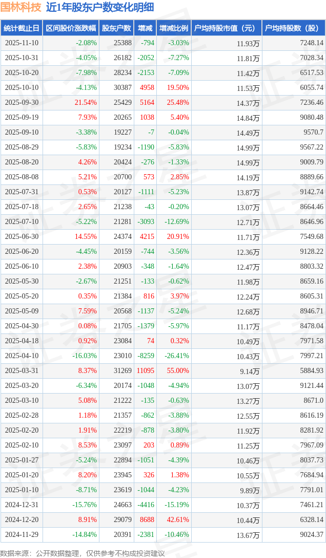 从股价来看,2025年10月31日至2025年11月10日,国林科技区间跌幅为2.08%,在此期间股东户数减少794.0户,减幅为3.03%。