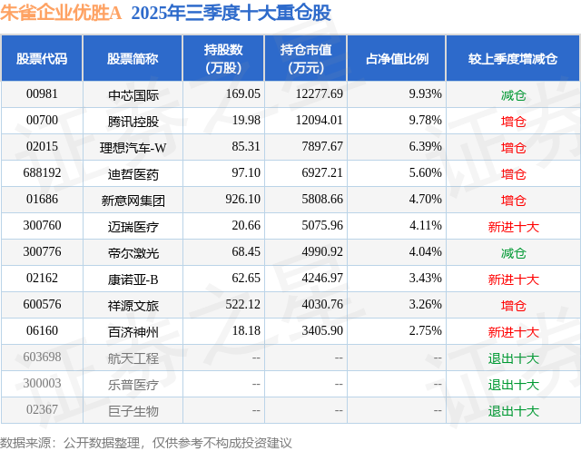 根据2025基金Q3季报公募基金重仓股数据,重仓该股的公募基金共4家,其中持有数量最多的公募基金为朱雀基金的朱雀企业优胜A。朱雀企业优胜A目前规模为6.67亿元,最新净值1.5424(11月12日),较上一交易日上涨0.01%,近一年上涨20.05%。该公募基金现任基金经理为陈飞。陈飞在任的基金产品包括:朱雀匠心一年持有,管理时间为2025年1月13日至今,期间收益率为24.08%;朱雀产业精选混合A,管理时间为2025年5月26日至今,期间收益率为14.27%;朱雀企业优选A,管理时间为2025年9月11日至今,期间收益率为-0.54%。