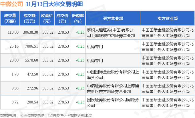 证券之星消息,11月13日中微公司发生大宗交易,交易数据如下: