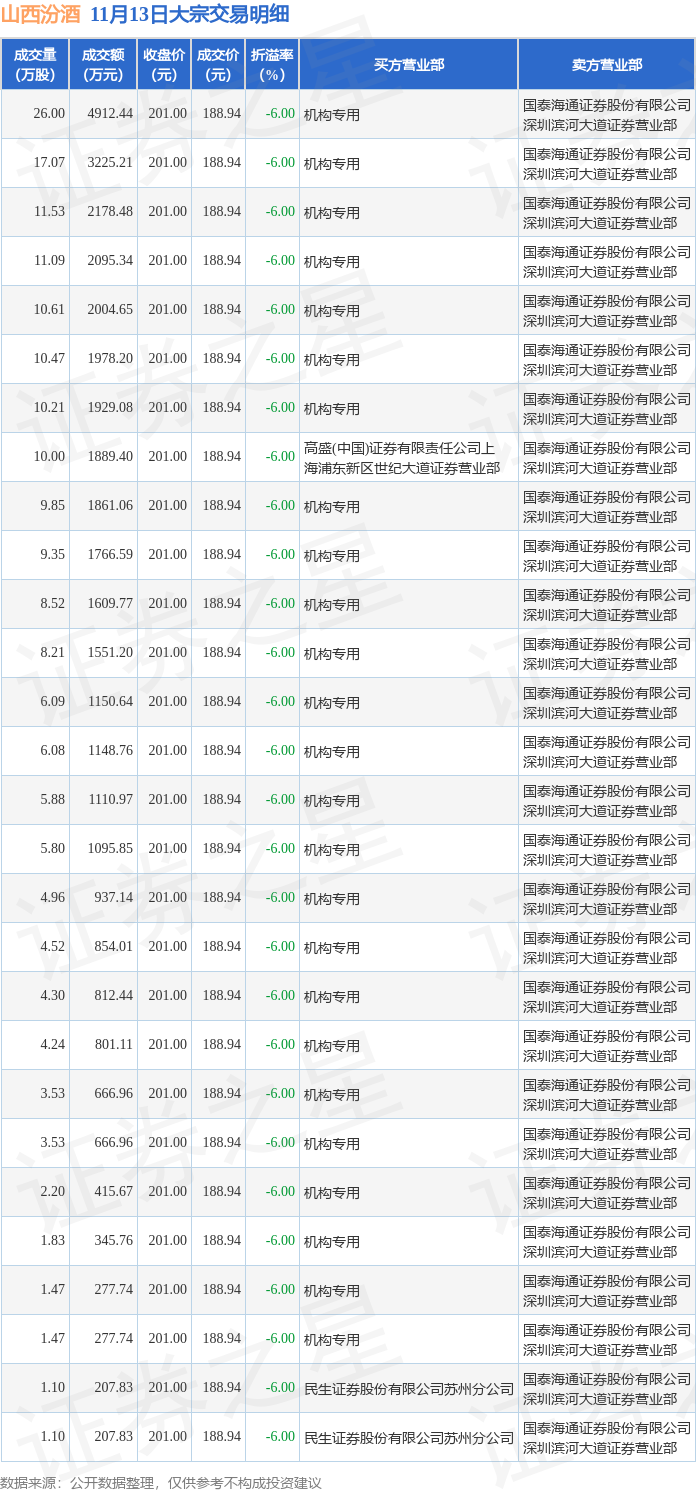 证券之星消息,11月13日山西汾酒发生大宗交易,交易数据如下:
