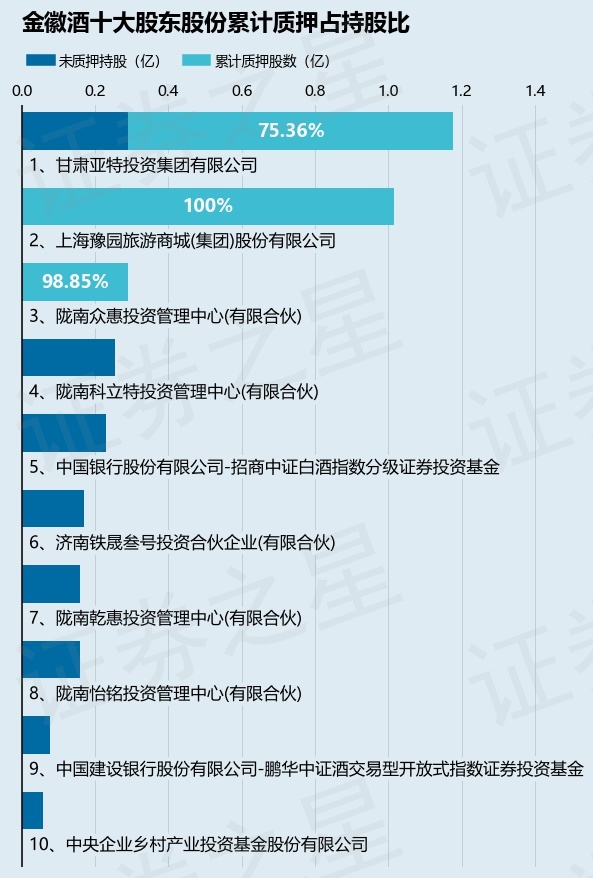 截止本公告日,股东甘肃亚特投资集团有限公司已累计质押股份8872.3万股,占其持股总数的75.36%,股东上海豫园旅游商城(集团)股份有限公司已累计质押股份1.01亿股,占其持股总数的100.0%,股东陇南众惠投资管理中心(有限合伙)已累计质押股份2873.0万股,占其持股总数的98.85%。本次质押后金徽酒十大股东的累计质押股份占持股比例(占持股比例的计算以公司最新一期财务报表公布的十大股东的持股总数为基准)见下图: