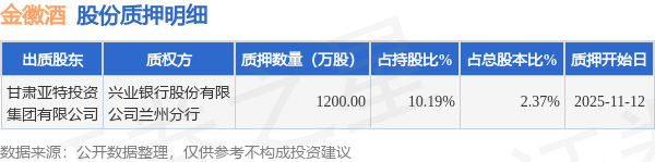 证券之星消息,金徽酒(603919)11月13日公开信息显示,股东甘肃亚特投资集团有限公司向兴业银行股份有限公司兰州分行合计质押1200.0万股,占总股本2.37%。质押详情见下表:
