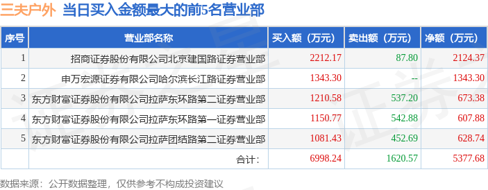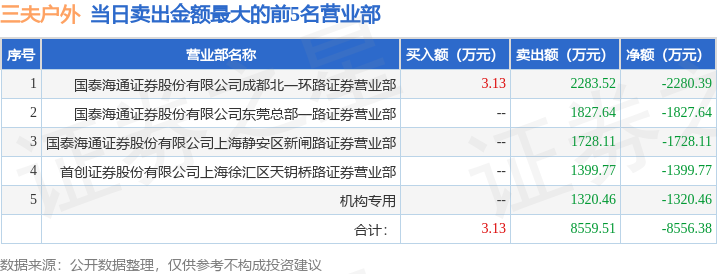证券之星消息,沪深交易所2025年11月17日公布的交易公开信息显示,三夫户外(002780)因日跌幅偏离值达到7%的前5只证券登上龙虎榜。此次是近5个交易日内第2次上榜。