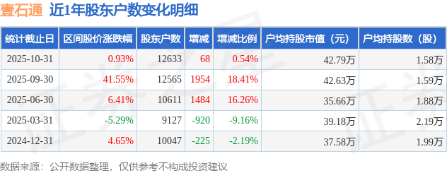 从股价来看,2025年9月30日至2025年10月31日,壹石通区间涨幅为0.93%,在此期间股东户数增加68.0户,增幅为0.54%。