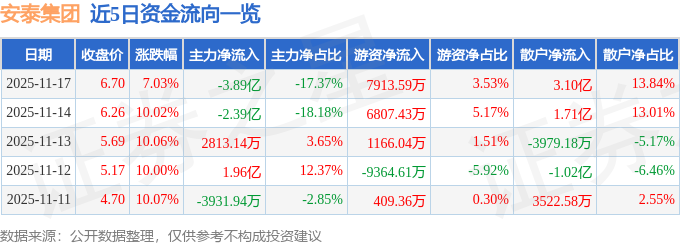 11月17日的资金流向数据方面,主力资金净流出3.89亿元,占总成交额17.37%,游资资金净流入7913.59万元,占总成交额3.53%,散户资金净流入3.1亿元,占总成交额13.84%。