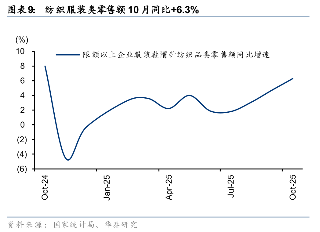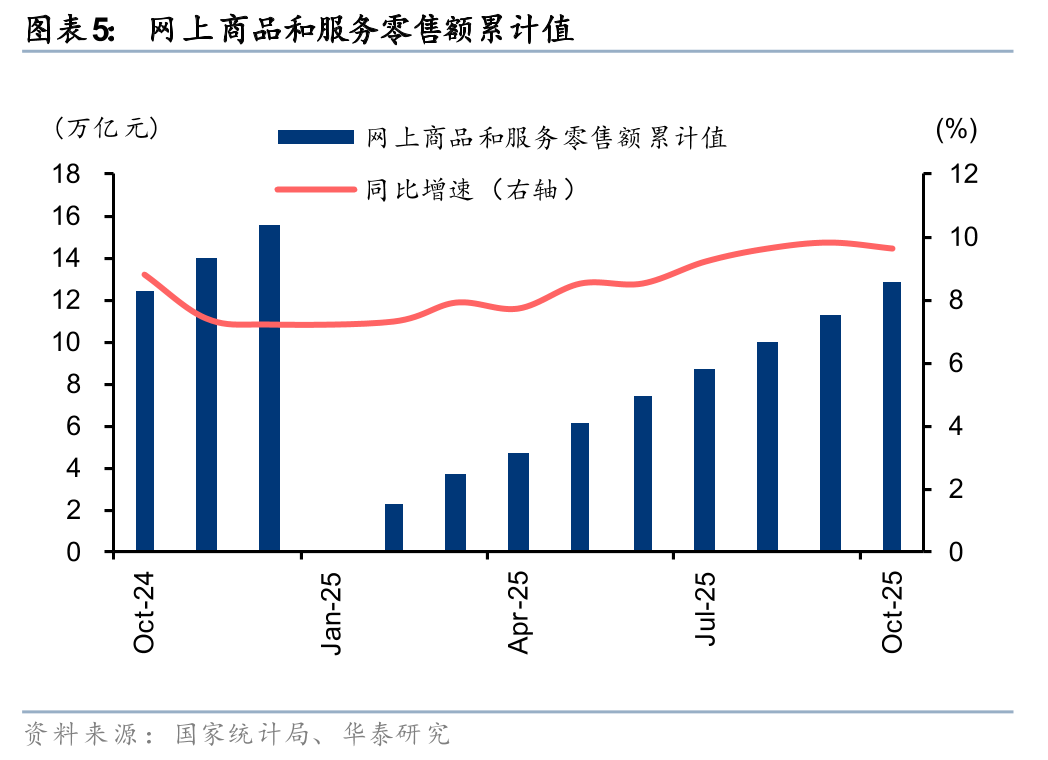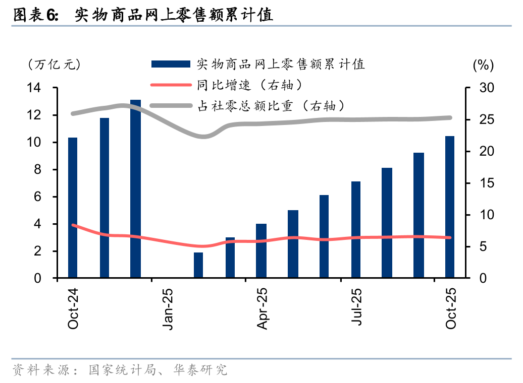 1)分业态看,10月餐饮收入及商品零售额分别同比+3.8%/+2.8%,增速分别环比+2.9pct/-0.5pct,双节效应带动餐饮业态增速回暖;2)分渠道看,我们测算10月实物商品网上零售额同增4.9%,高于社零整体增速约2.0pct,或受“双十一”促销期前置提振。线下渠道中,1-10月便利店/超市/百货零售额同比+6.3%/+4.7%/+1.0%,增速较1-9月-0.1/+0.3/+0.1pct,整体受假日经济带动有所回暖,其中1-10月仓储会员店、无人值守商店、集合店等新业态零售额持续保持两位数增长,新型消费渠道活力释放。
